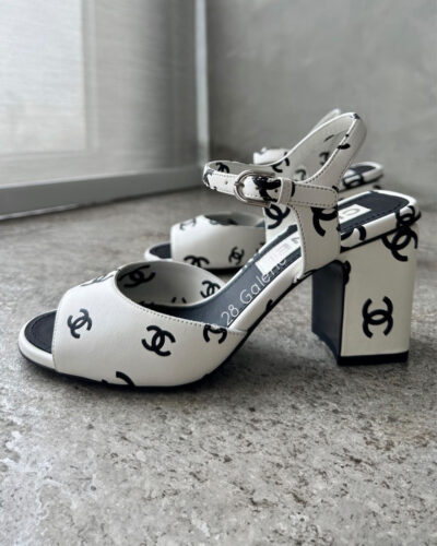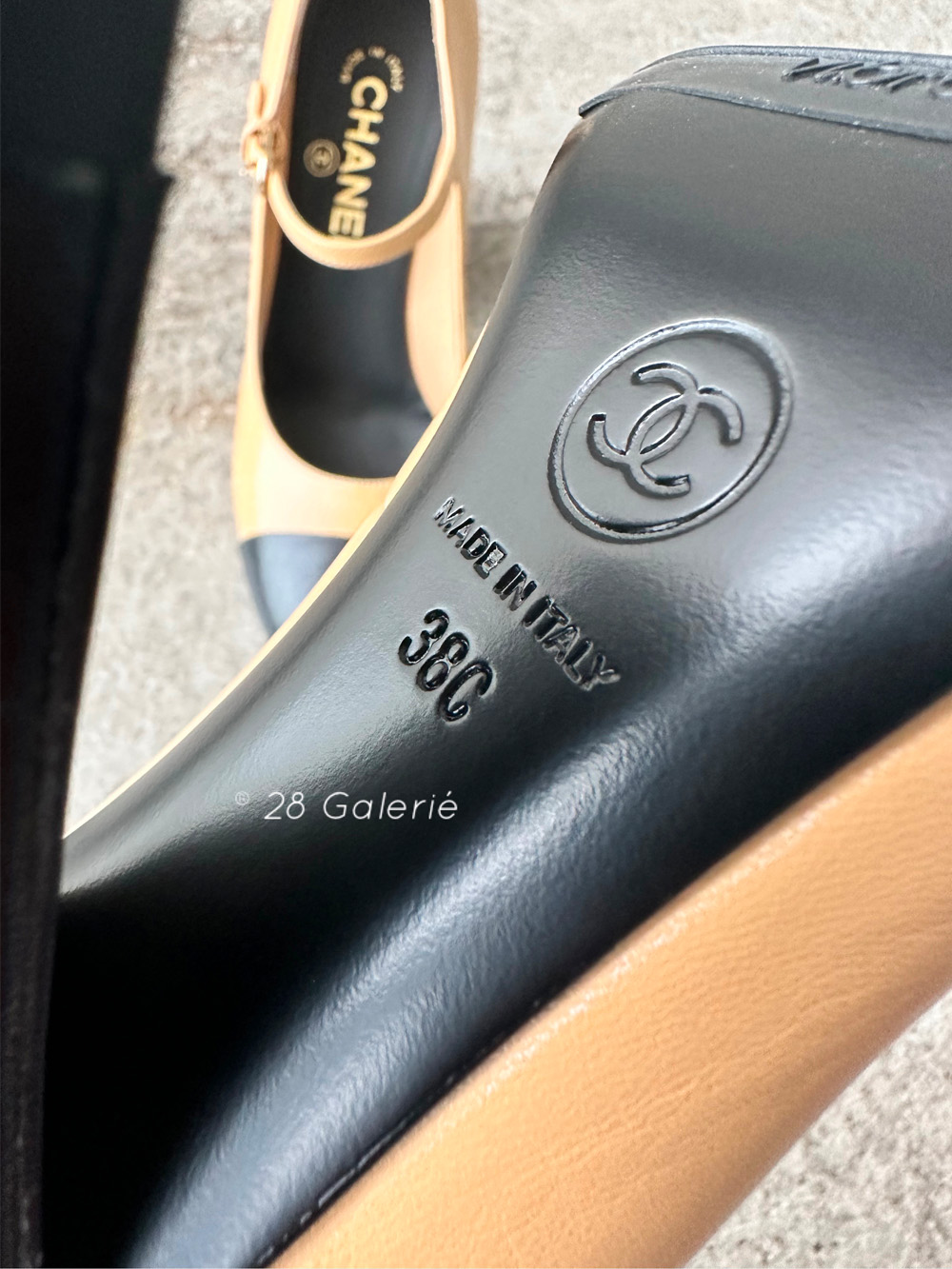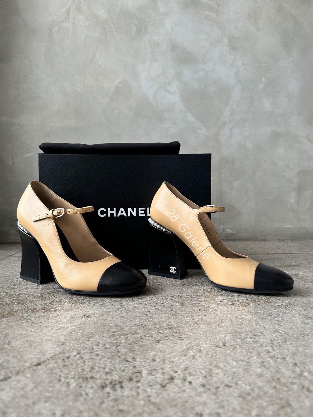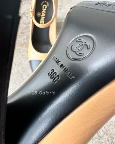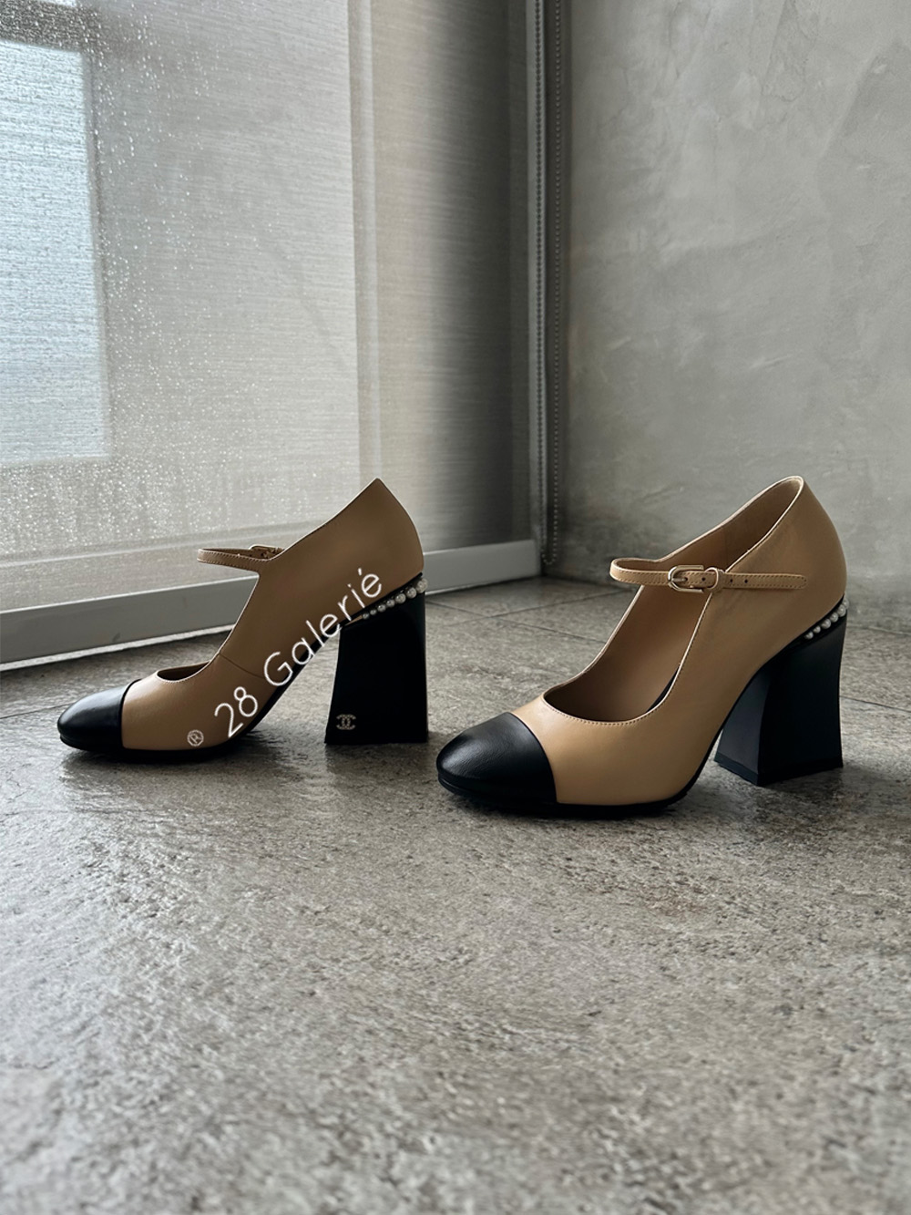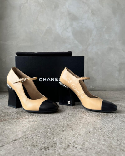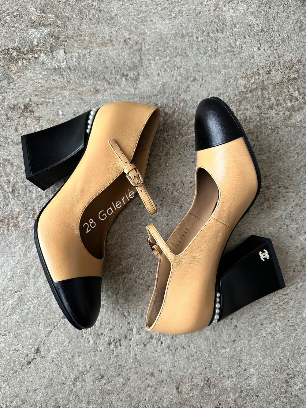Chanel 22A Pearl Embellished Open Shoes with Shiny Goatskin Cap Toe Pumps