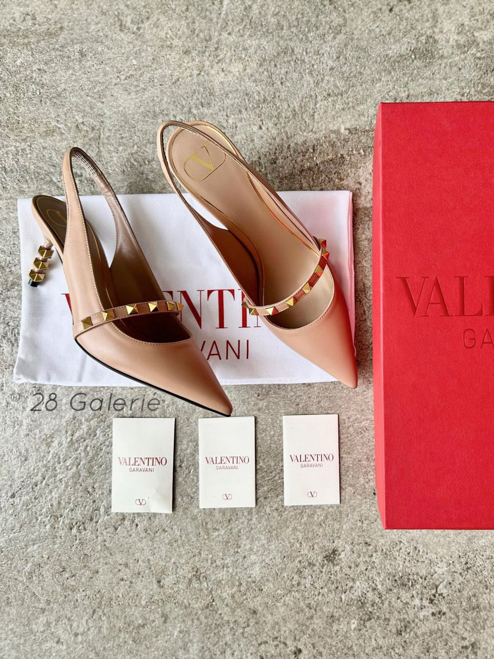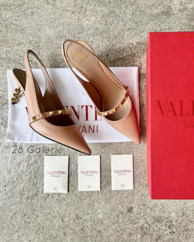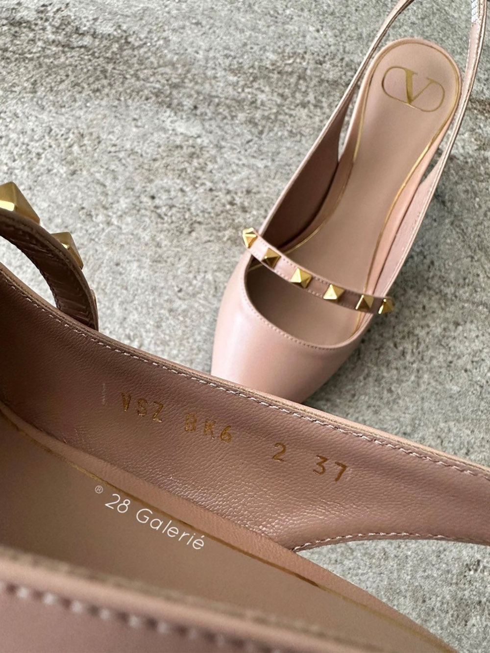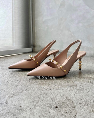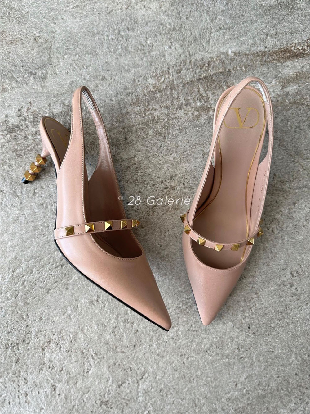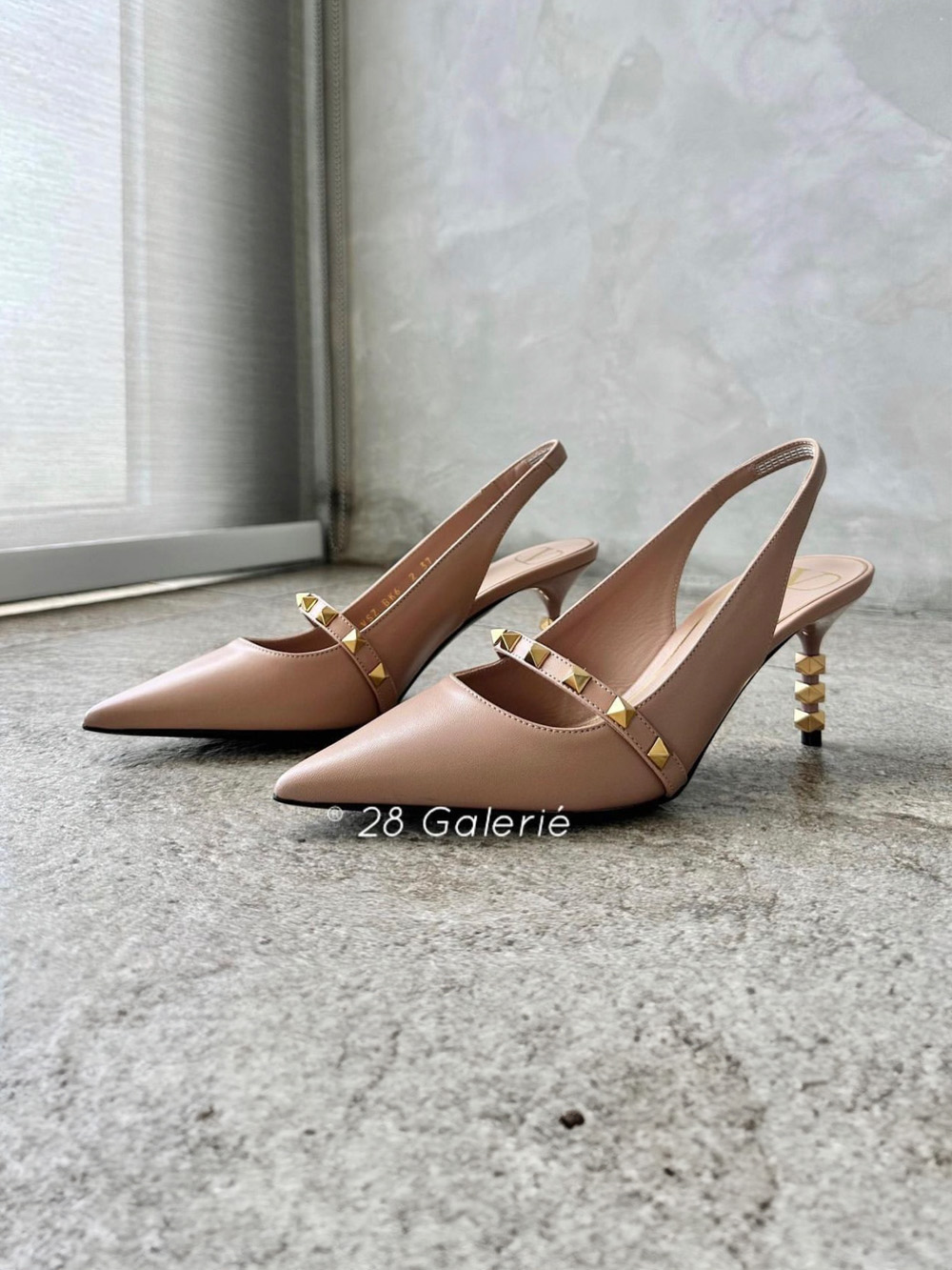 With stud embellishments, antique brass finish, slingback ankle strap, sculpted heel detailed with sequence of iconic four-sided studs. Made in Italy.